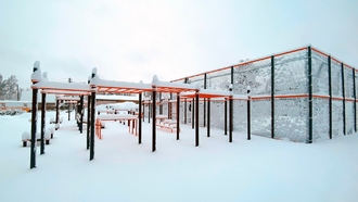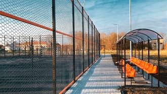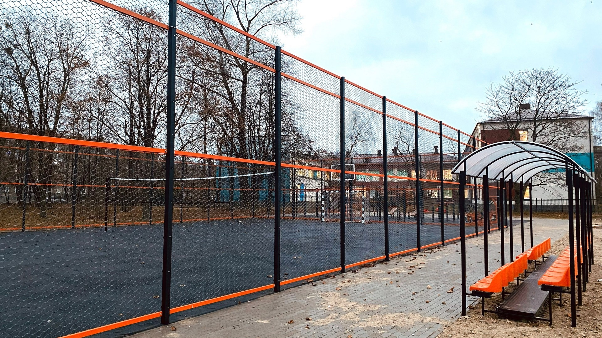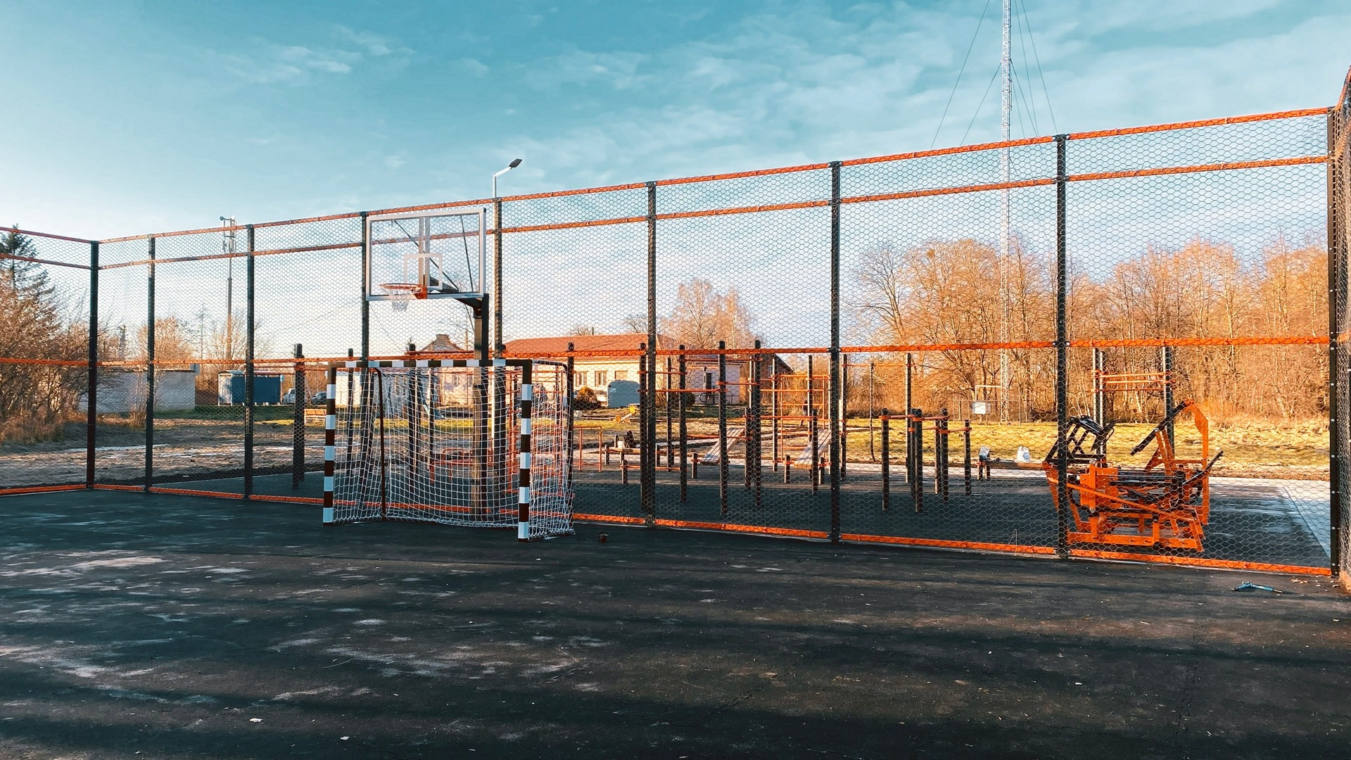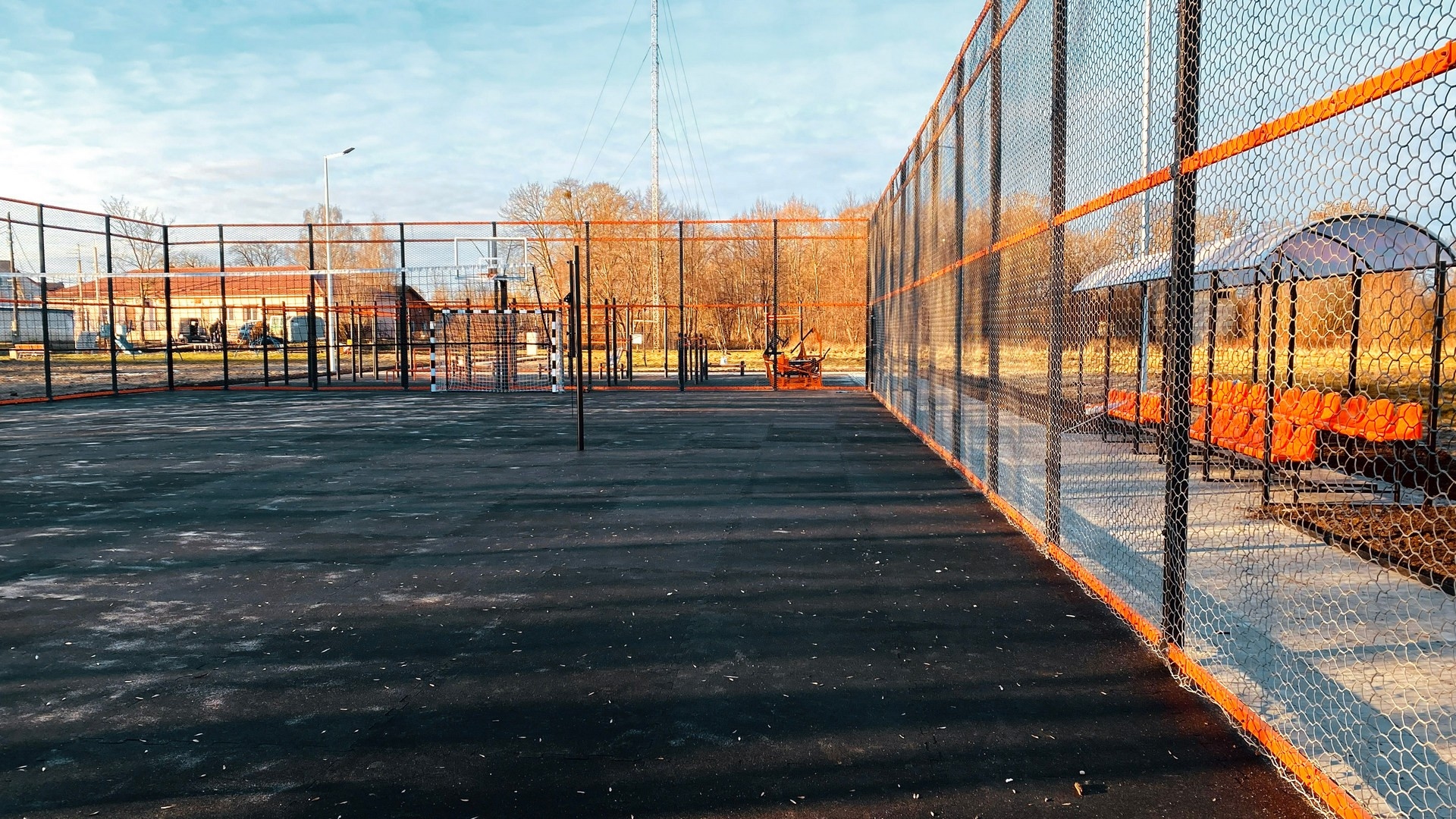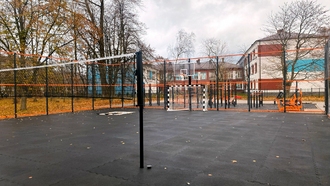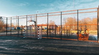 - Ограждение 32х19м с баскетбольными стойками. Внутри площадки произведена укладка травмобезопасного покрытия, подходящего для игровых видов спорта.