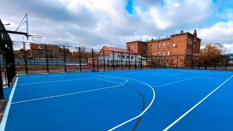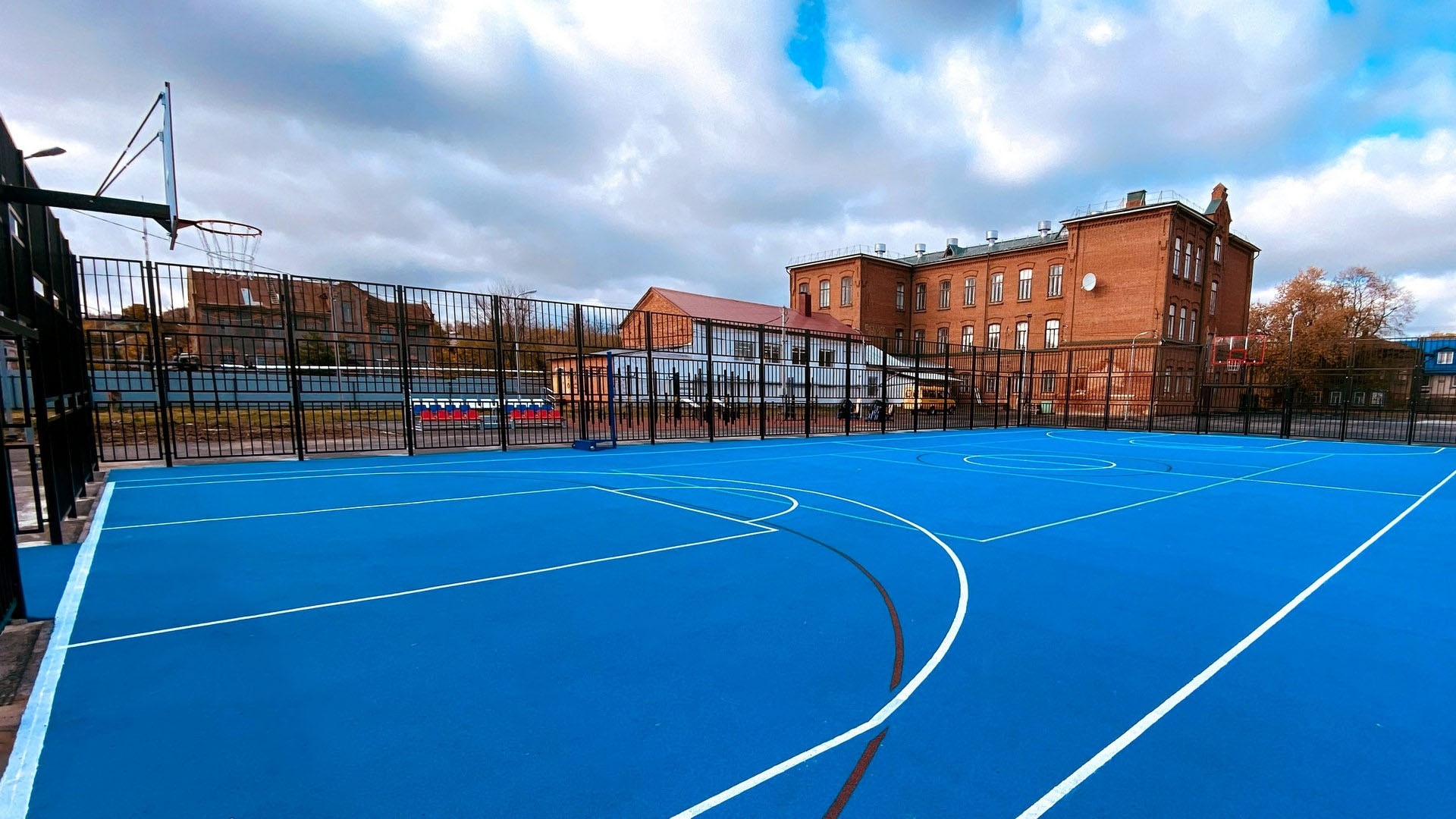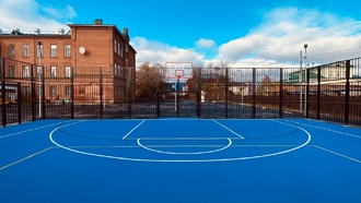 - Профильное ограждение 32х19м со встроенными футбольными воротами и баскетбольными стойками. Внутри площадки произведена укладка бесшовного травмобезопасного покрытия для игровых видов спорта. Разметка для футбола баскетбола и волейбола нанесена полиуретановой краской, устойчивой к износу и температурным колебаниям.