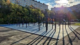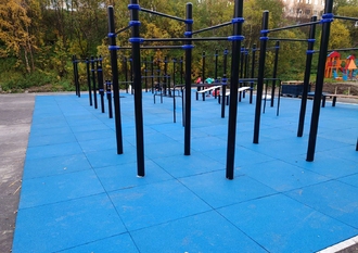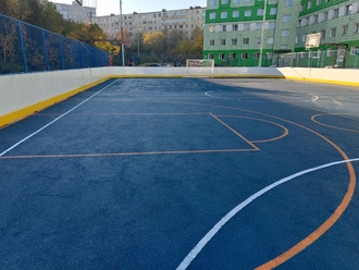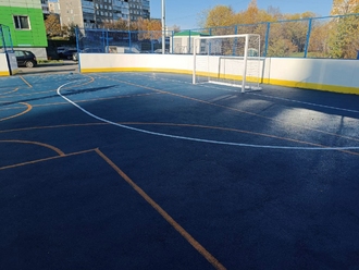 - Уличные хоккейные борта с ограждающей сеткой по периметру. Внутри площадки произведена укладка травмобезопасного бесшовного покрытия для игры в баскетбол, футбол и хоккей. Разметка нанесена полиуретановой краской, устойчивой к износу и температурным колебаниям.