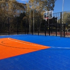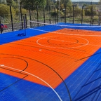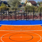 - Профильное ограждение 32х19м со встроенными футбольными воротами и баскетбольными стойками. Внутри площадки произведена укладка современного модульного покрытия для игровых видов спорта. Разметка для футбола баскетбола и волейбола нанесена полиуретановой краской, устойчивой к износу и температурным колебаниям.